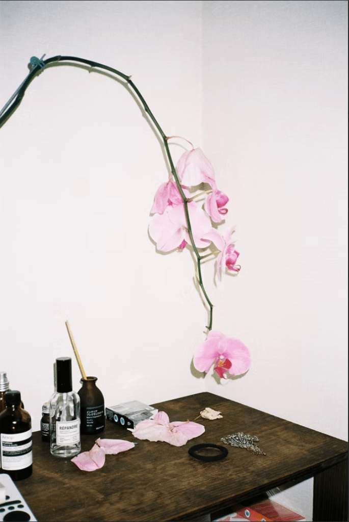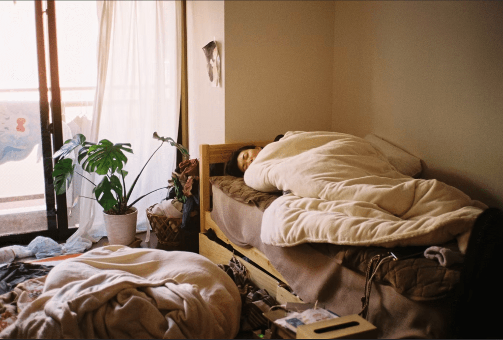 Wang often photographs people in states of repose. In Passing, an ongoing project from 2019, captures fragments of young-adult life in her native Taiwan. I rifle through these images: someone tucked into bed in a messy bedroom, soft morning light creeping through the apertures of a monstera; a woman sprawled on a couch, her right foot kicking the air, her hands forming a hammock beneath her head; a sleeping face cradled in someone’s palm behind an empty glass of beer and the remnants of a shared meal.
