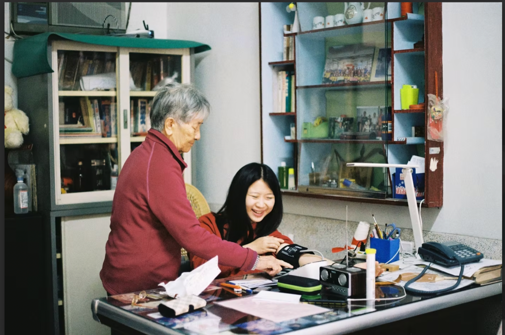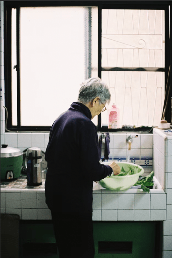 This same tenderness runs through Liu’s Family, a series composed in 2023 with the relatives of a friend in rural southern Taiwan. Wang’s research into family portraiture across cultures quietly informs these depictions of intergenerational care and cohabitation. They feel slower and more composed than In Passing, yet no less intimate. In these images of washing vegetables and recording a grandchild’s blood pressure, I find myself observing the tiles of the kitchen sink, the spacing of bodies, and the family heirlooms within glass cabinets as closely as I study their faces.